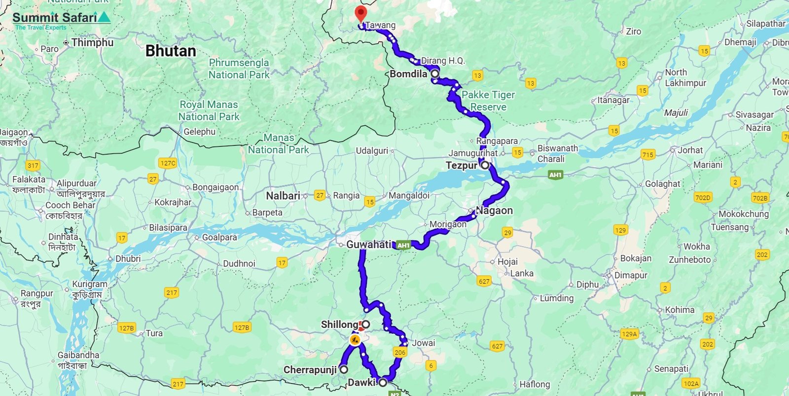 Place Wise Itinerary : Shillong (1 Night) > Cherapunji (1 Night) > Dawki (1 Night) > Shillong (1 Night) > Tezpur (1 Night) > Bomdila (1 Night) > Tawang (2 Night) > Bomdila (1 Night)