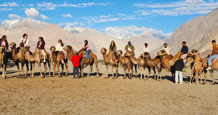 Later, we check into our hotel and proceed to visit the famous Hunder Sand Dunes. Nubra Valley lies on the ancient Silk Route, and the unique double-humped Bactrian camels found here are remnants of that trade era, when caravans travelled between India and Central Asia. Camel rides are available after 3:00 PM, and you can choose to ride these rare double-humped camels or enjoy a peaceful walk through the sand dunes, capturing beautiful photographs against the dramatic desert landscape. Near the sand dunes, you can also enjoy a 30-minute Ladakhi traditional dance performance, offering you a wonderful glimpse into the rich culture, music, and heritage of Ladakh. This colourful dance show, accompanied by traditional Ladakhi songs, adds a memorable cultural experience to your visit to Hunder Sand Dunes.